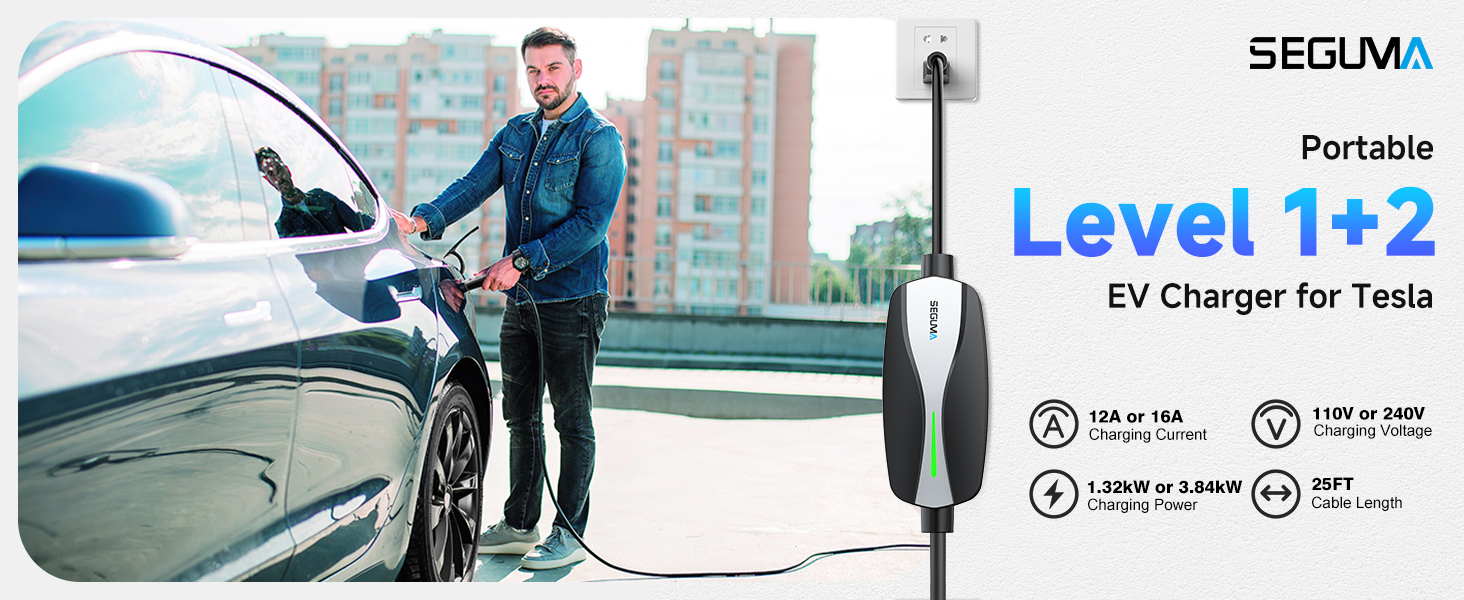SEGUMA Level 1/2 Tesla Charger (12A/16A, Dual Voltage, NACS)