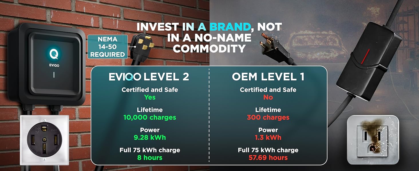 EVIQO Level 2 EV Charger 40A, 9.6 kW, NEMA 14-50, Wi-Fi Smart Charger (GEN 2)